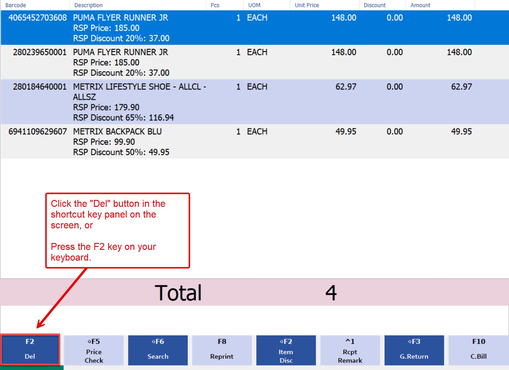 • Click the “Del” button in the shortcut key panel on the screen, or