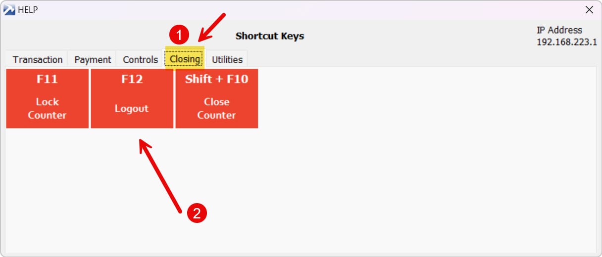 1. To logout or close the POS, press the shortcut key “F12” on the keyboard and this will log you out of the POS system.