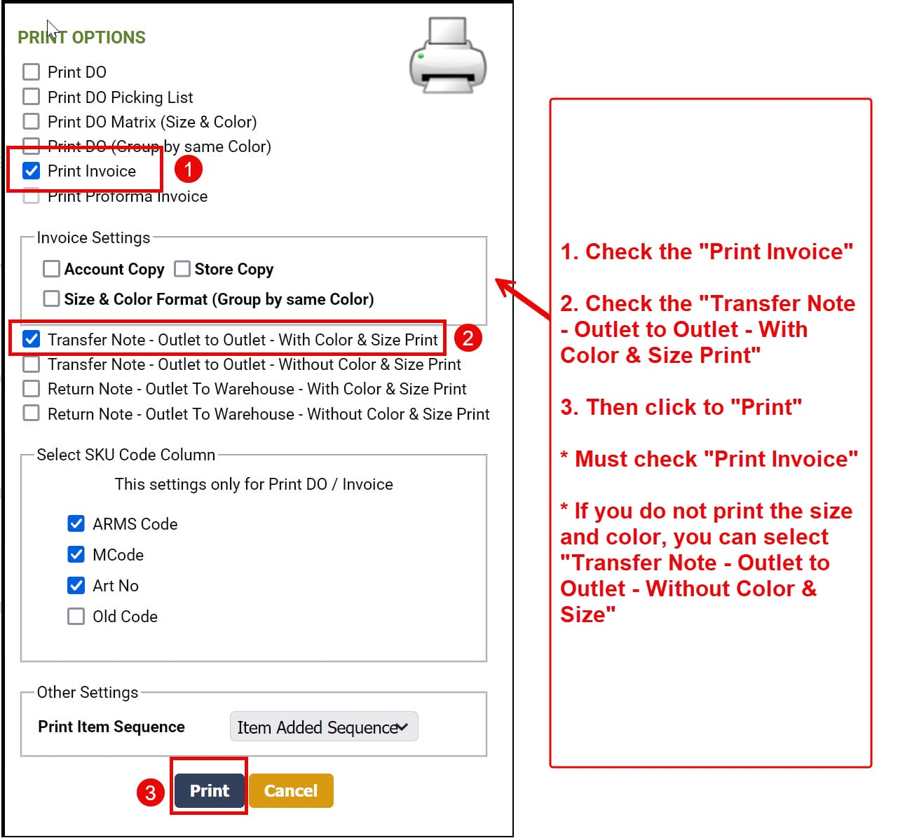 7. At the printing page, please make sure you check “Print Invoice” and “Transfer Note – Outlet to Outlet – With Color & Size”