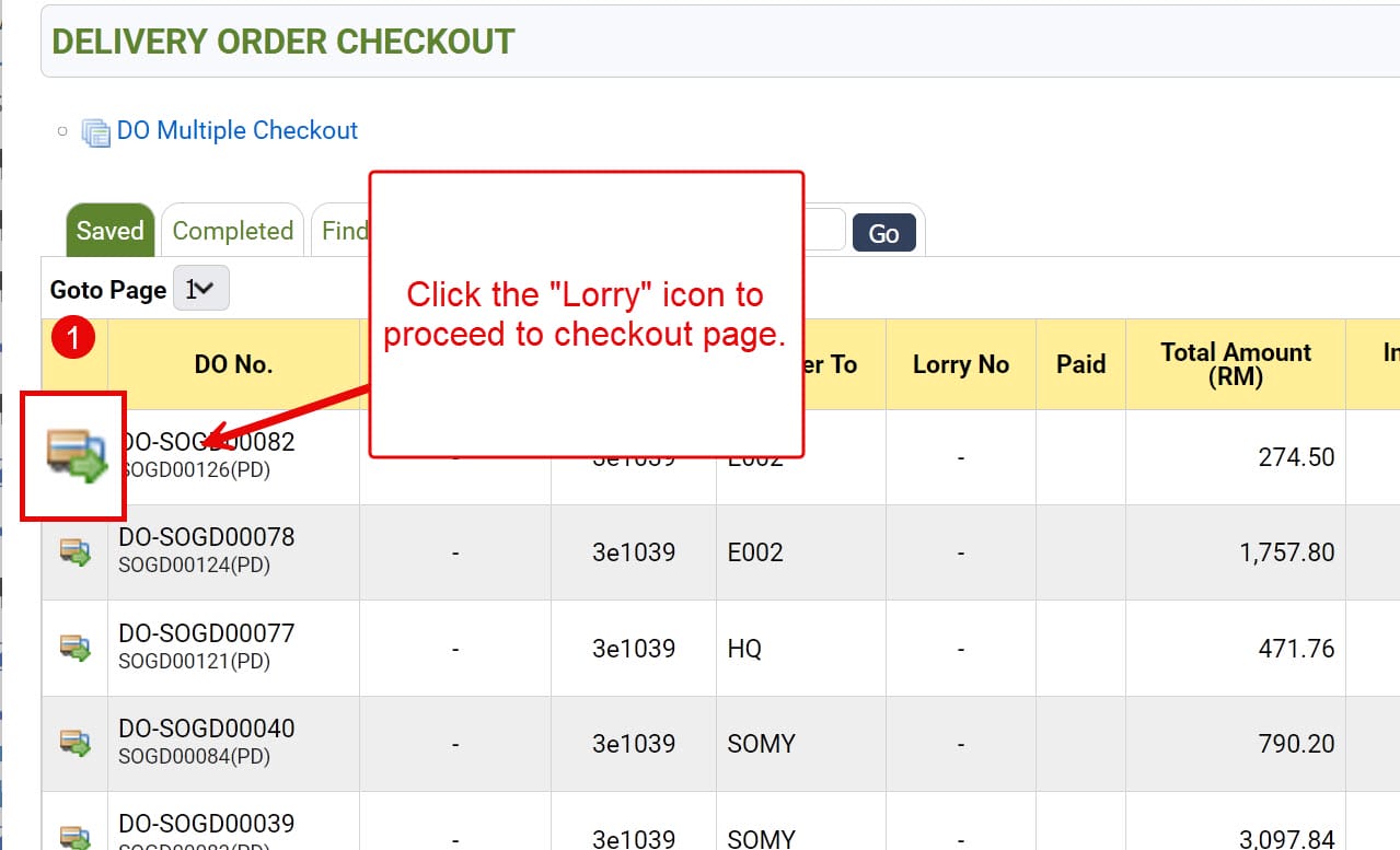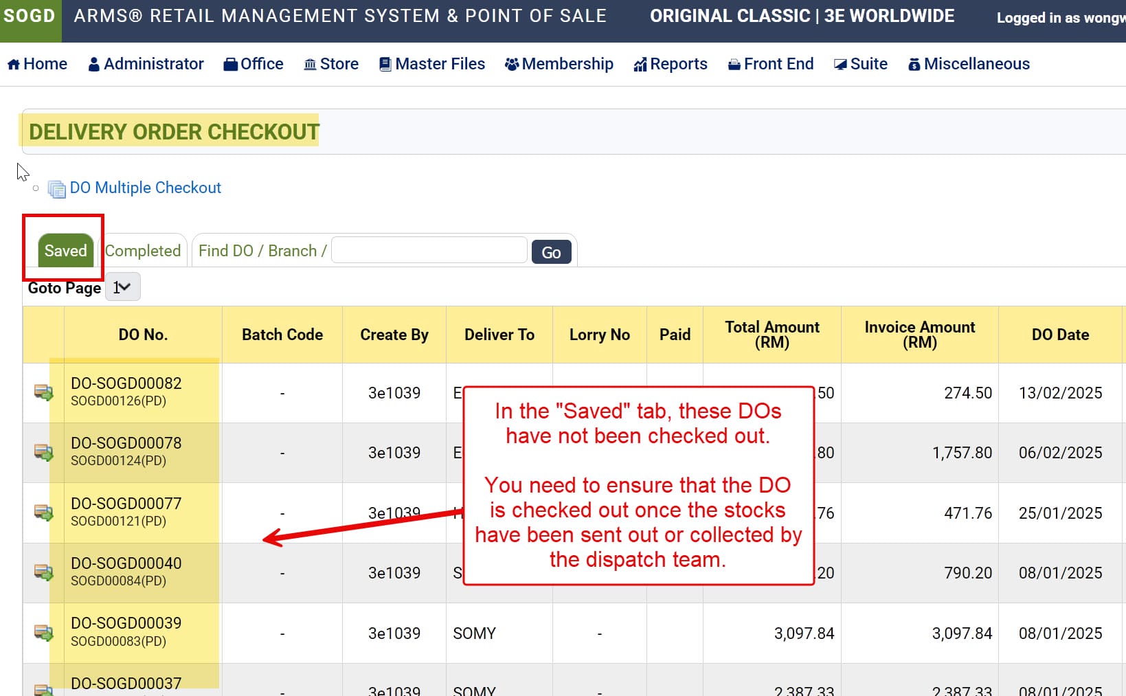 3. In the “Saved” tab, these DOs have not been checked out. You need to ensure that the DO is checked out once the stocks have been sent out or collected by the dispatch team.