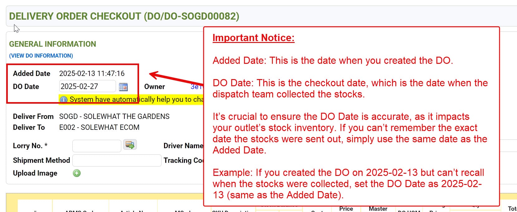 Example: If you created the DO on 2025-02-13 but can’t recall when the stocks were collected, set the DO Date as 2025-02-13 (same as the Added Date).