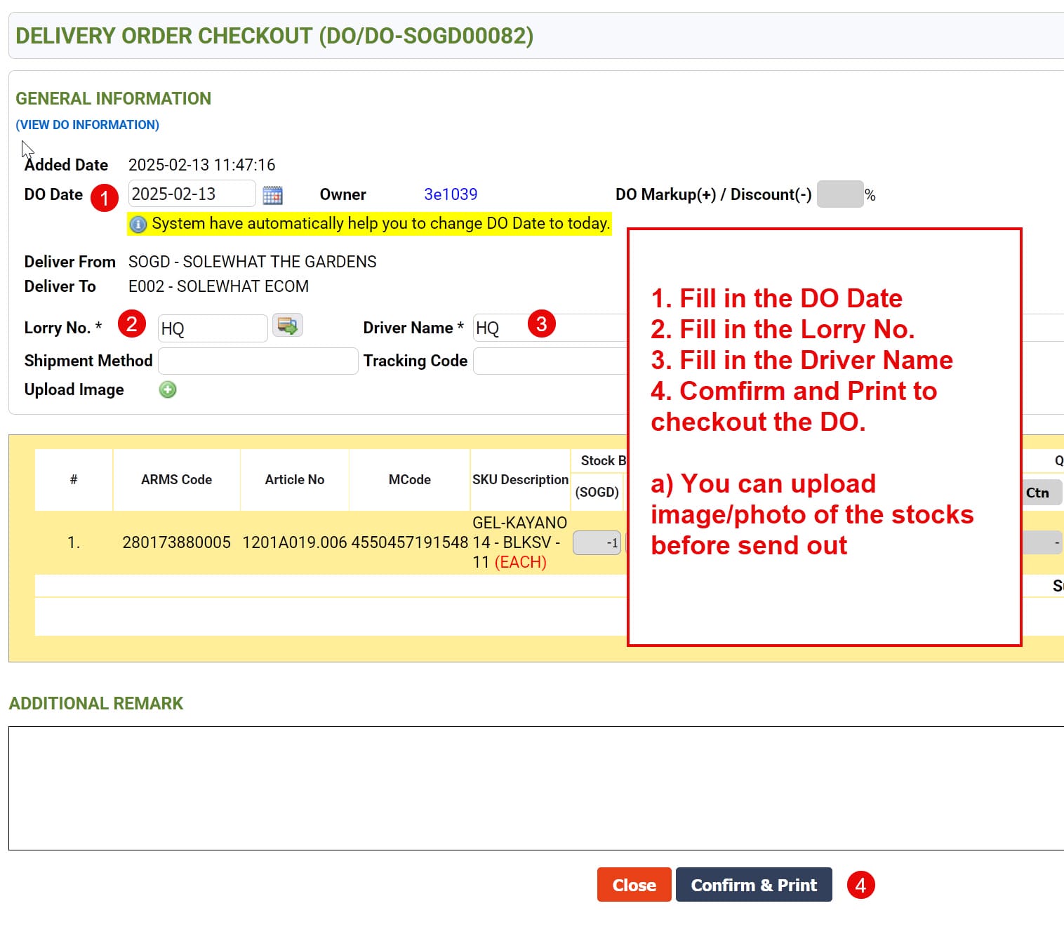 * You do not need to provide the printed invoice copy to the dispatch/driver, only provide the DO Checkout copy (Transfer Note)