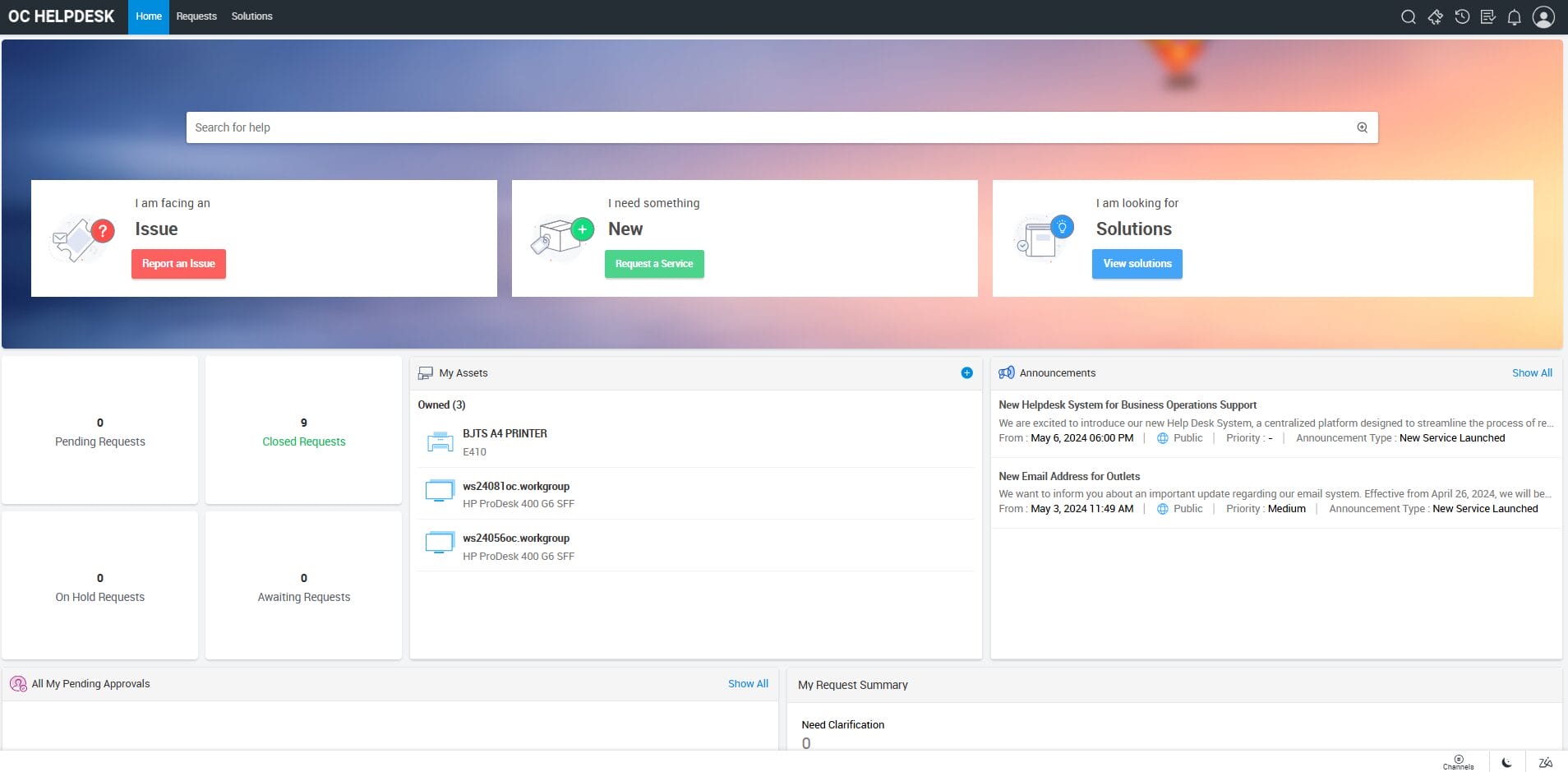 The OC Helpdesk system is the official platform for all staff to submit service requests, report issues, and communicate with the support team. Please ensure you: