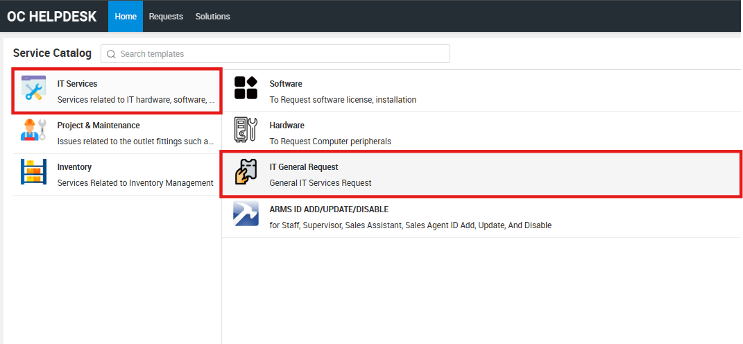 ๐ Example: If you want to make an IT-related request, select IT Services > IT General Request.