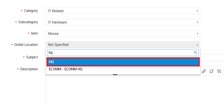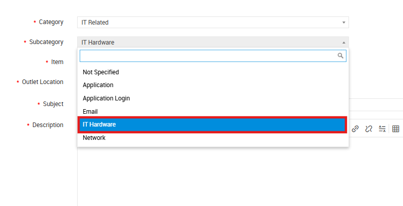 Choose the relevant Subcategory based on your issue or request type, such as: