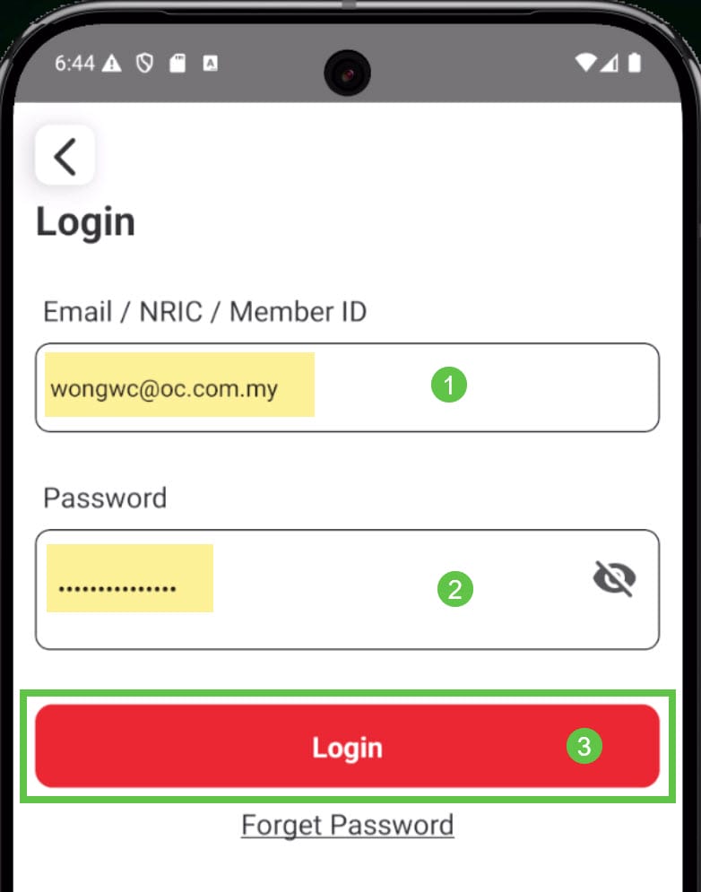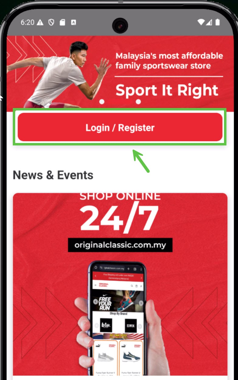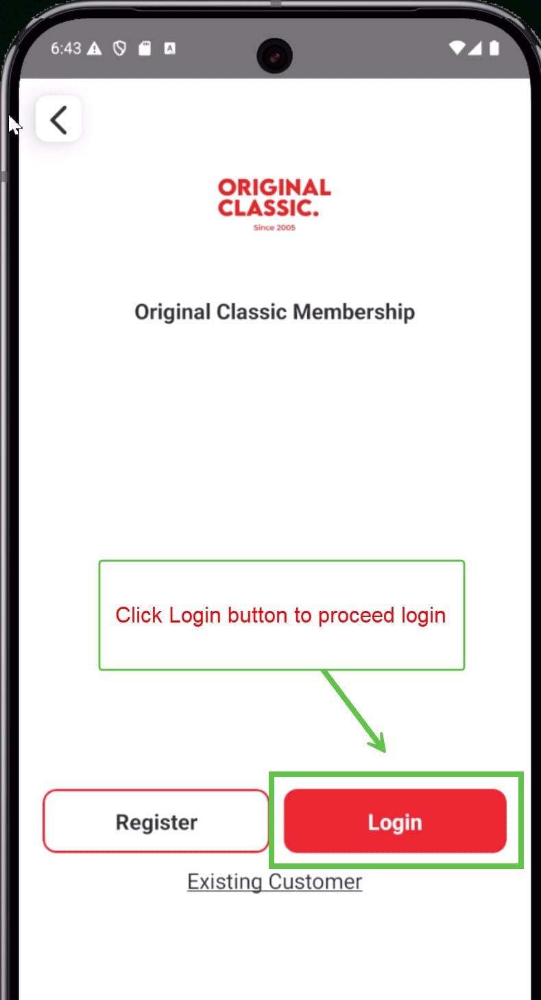 1. After installed the OC Membership apps, launch the apps and the Home screen show. Click the Login/Register button to register.