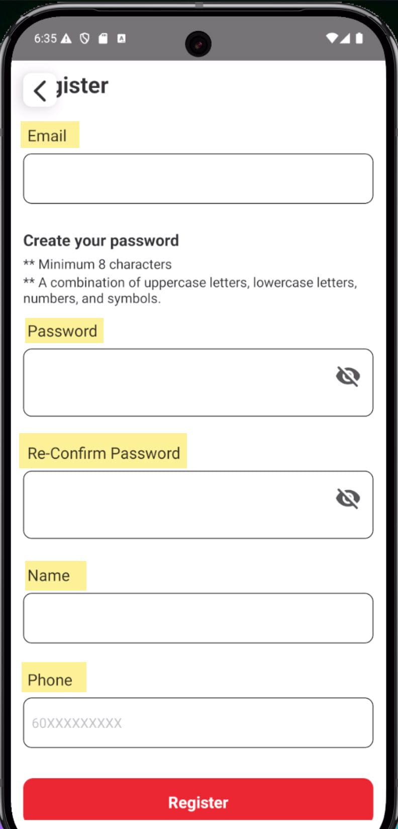 2. Customer has to fill up the compulsory fields to complete the registration. Such as Email, Password, Name and Phone no.