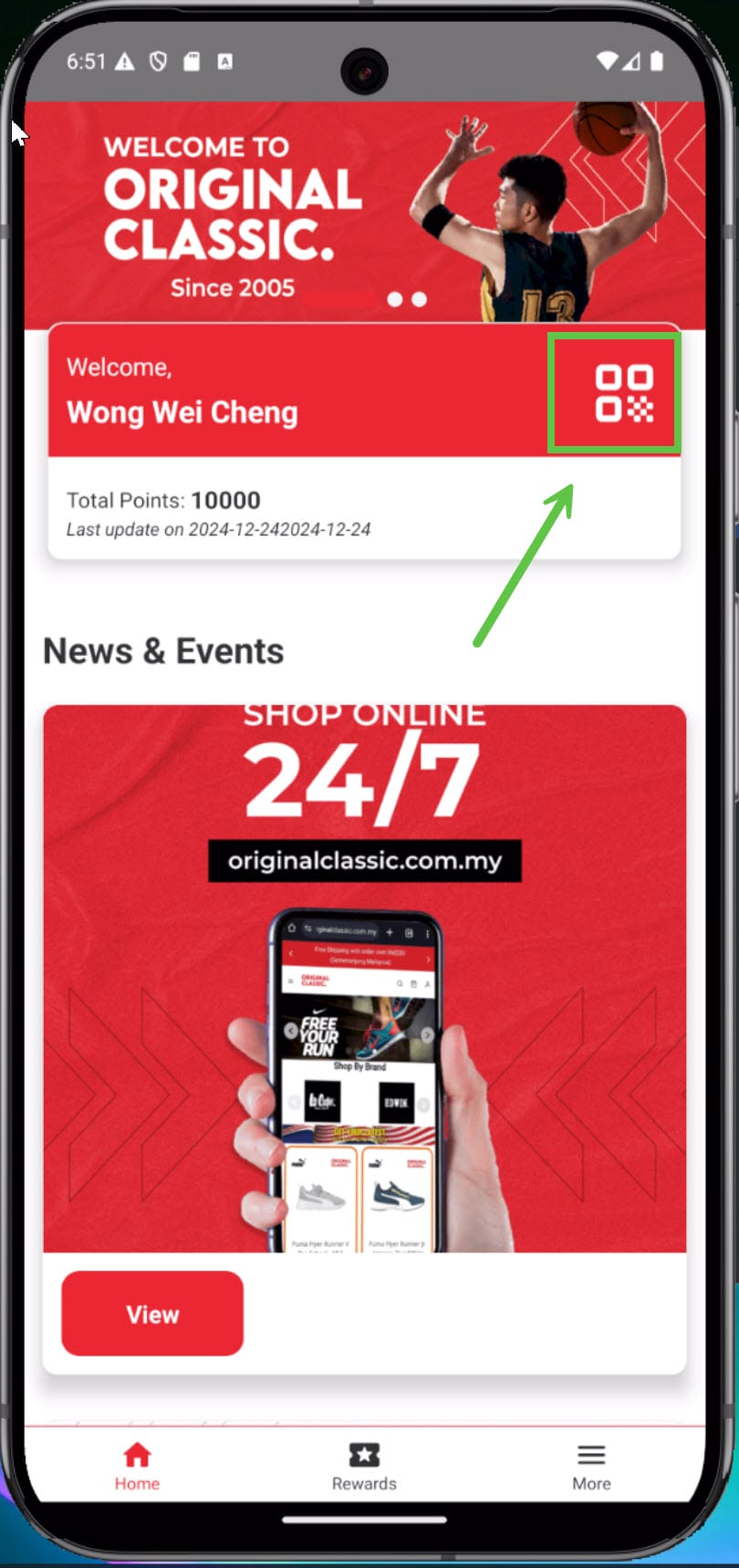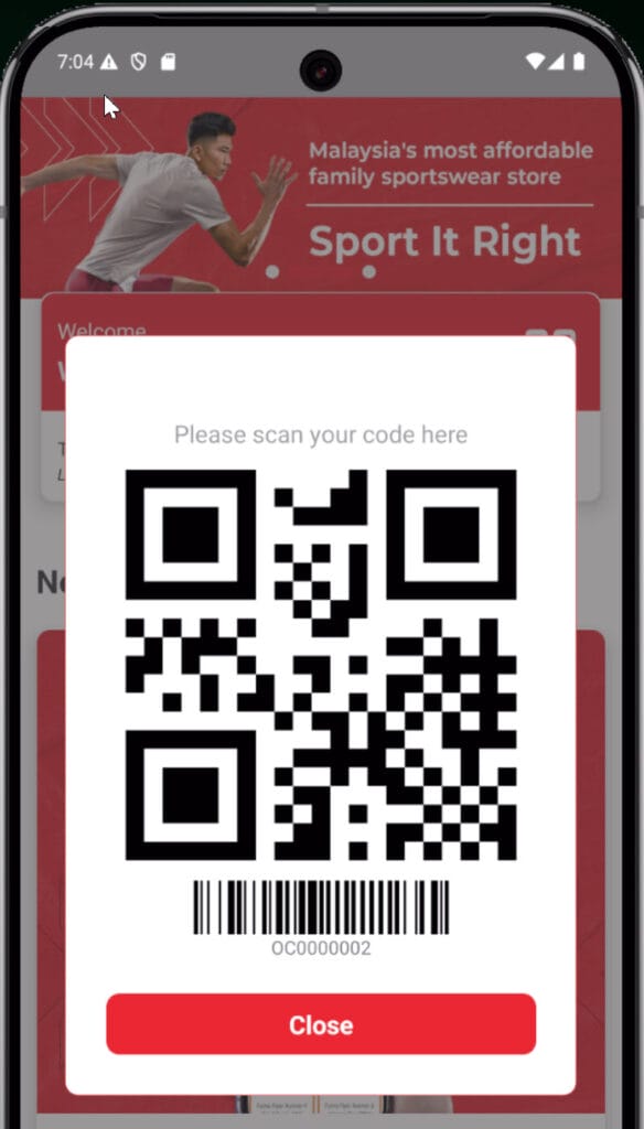 5. Once login successfully, the Home screen should show the customer’s name. Click on the QR code tab to view the customer ID and barcode.